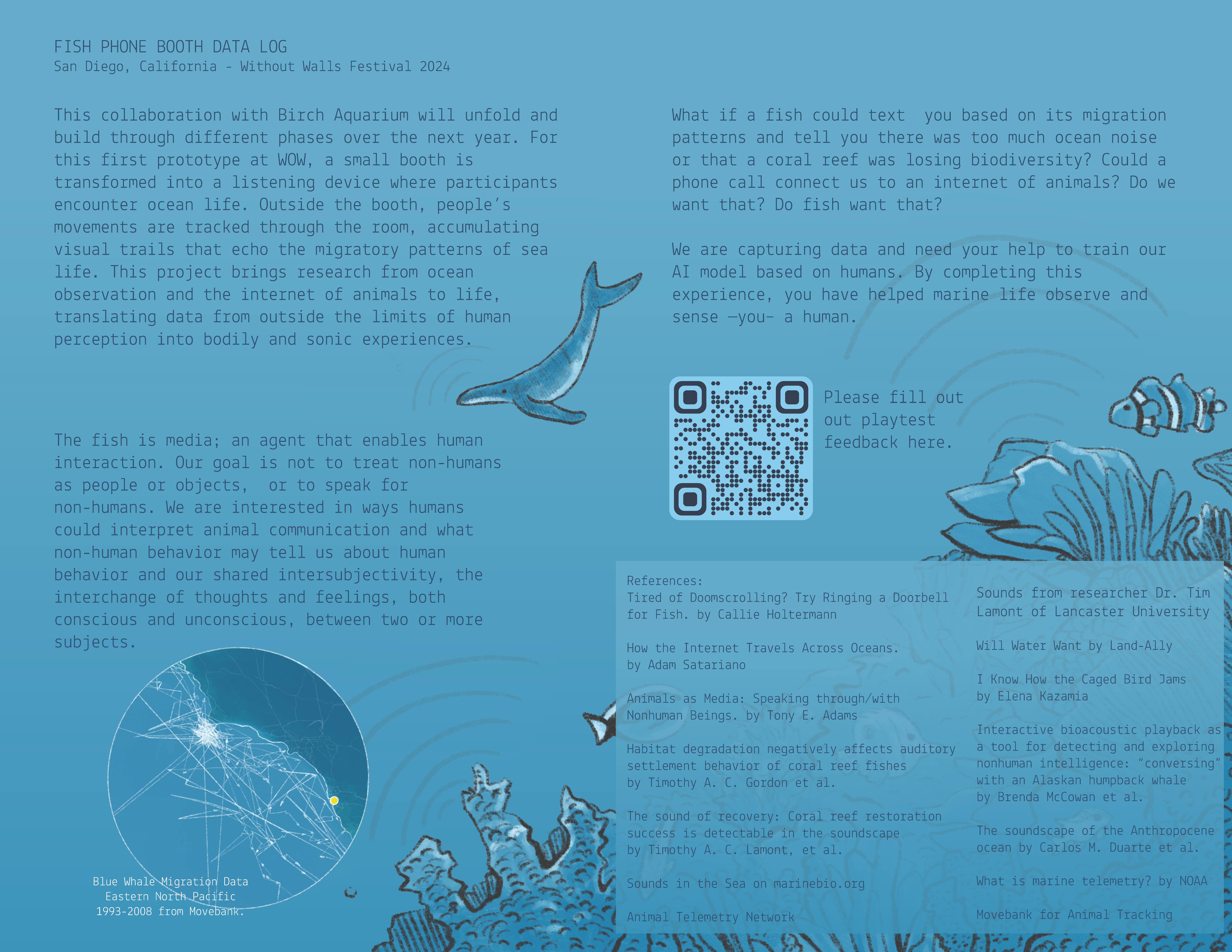 Fish Phone Booth is an interspecies communication prototype that uses interactive audio and sensory media in combination with scientists, data, and machine learning (AI). The experience is live in the Birch Aquarium and will be up through 2025.