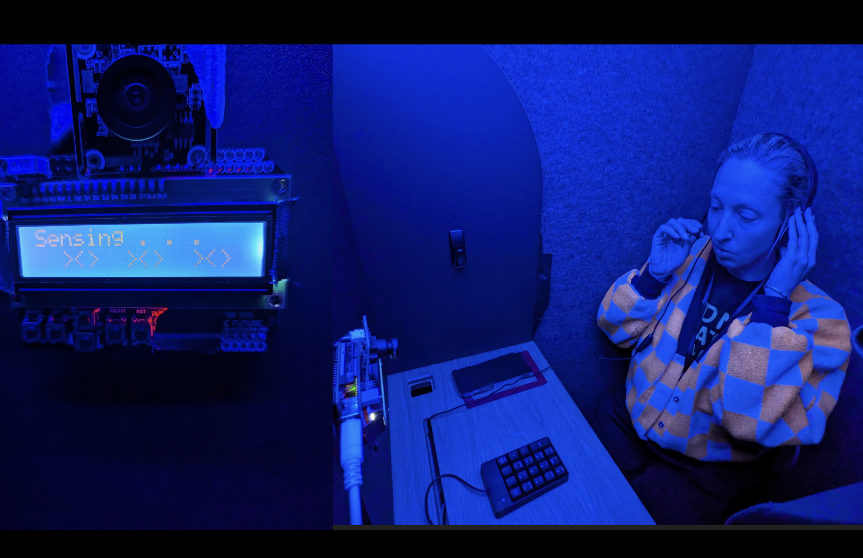 Inspired by this research, Smith and Twomey created a sculptural phone booth that acts as a speculative interface between human and oceanic life. Inside, participants are guided through a sound journey—listening to marine audio, layered storytelling, and ambient cues, and responding with their own vocalizations. Outside the booth, their movements are tracked and visualized as flowing trails that echo the migratory patterns of sea life.
